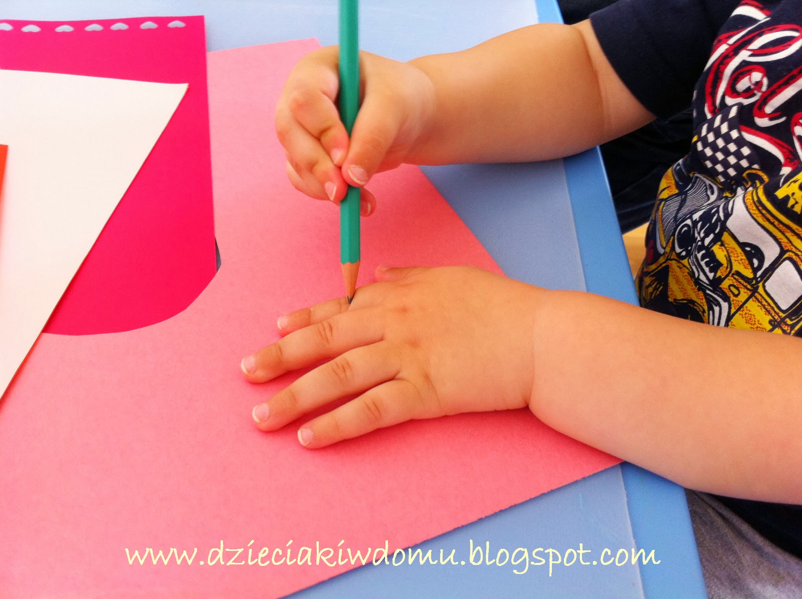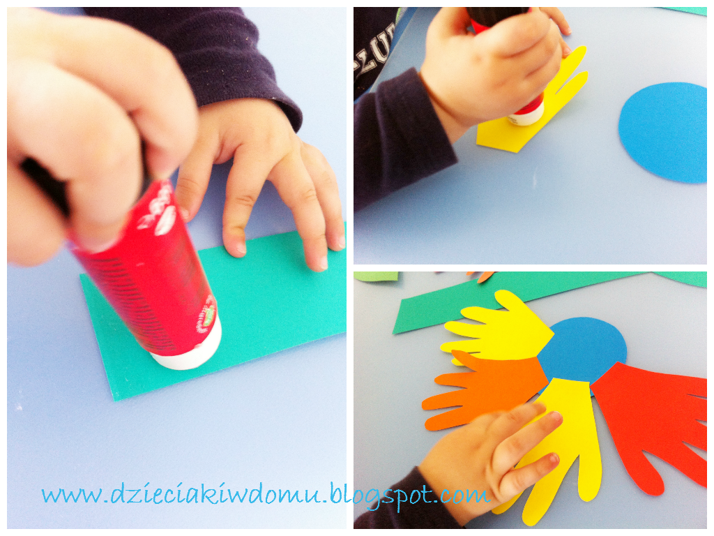 W pierwszej kolejności przygotowujemy wszystkie potrzebne elementy. Obrysowujemy rączki, rysujemy listek i łodygę oraz środek kwiatka. Potem wszystko wycinamy i łączymy w całość. Nie chodzimy jeszcze ani do przedszkola, ani do szkoły, więc nasze kwiatki powędrowały do babć. :)