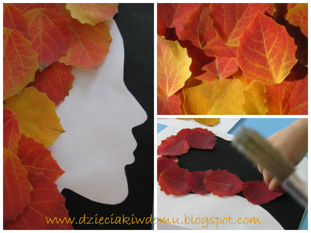 Potrzebne będą: jesienne liście, białe i czarne kartki z bloku technicznego, szablon profilu twarzy, klej do prac plastycznych, (opcjonalnie duży czarny karton)