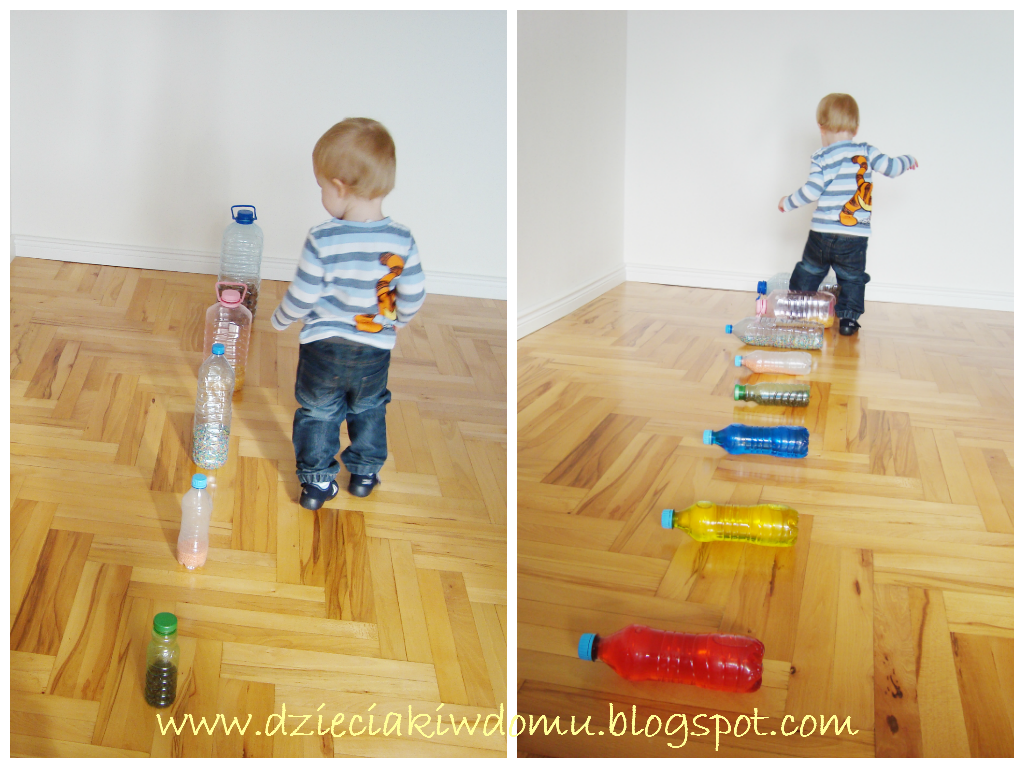Pierwszą taką butelkę zrobiłam dla Allanka, kiedy był jeszcze całkiem malutki. Na początku mieliśmy małe buteleczki, które były najlepszymi grzechotkami. W każdej coś innego: inny kształt, kolor i dźwięk. Z czasem, jak Allanek był coraz starszy, powstawały nowe butelki do naszej kolekcji. Każda z nich to kolejna możliwość zabawy, np. wsypywanie orzechów do butelki, przesypywanie ich do miski, z miski do pudełka i znowu do butelki (zabawa na dłuuuuugi czas). Potem zabawa w ustawianie butelek jedna na drugiej, od największej do najmniejszej i na odwrót. Butelki to też świetne klocki, można z nich budować mur, fortecę, drogę albo tylko to, co podpowie Waszym dzieciom wyobraźnia. Mogą posłużyć za kręgle, można je turlać, przewracać rączkami, nóżkami, albo rzucać w nie piłeczkami. Naszą ostatnią zabawą są najróżniejsze tory przeszkód. Tak nauczyliśmy się chodzić slalomem, a teraz ćwiczymy skakanie :). A Wy co zrobicie z butelkami?