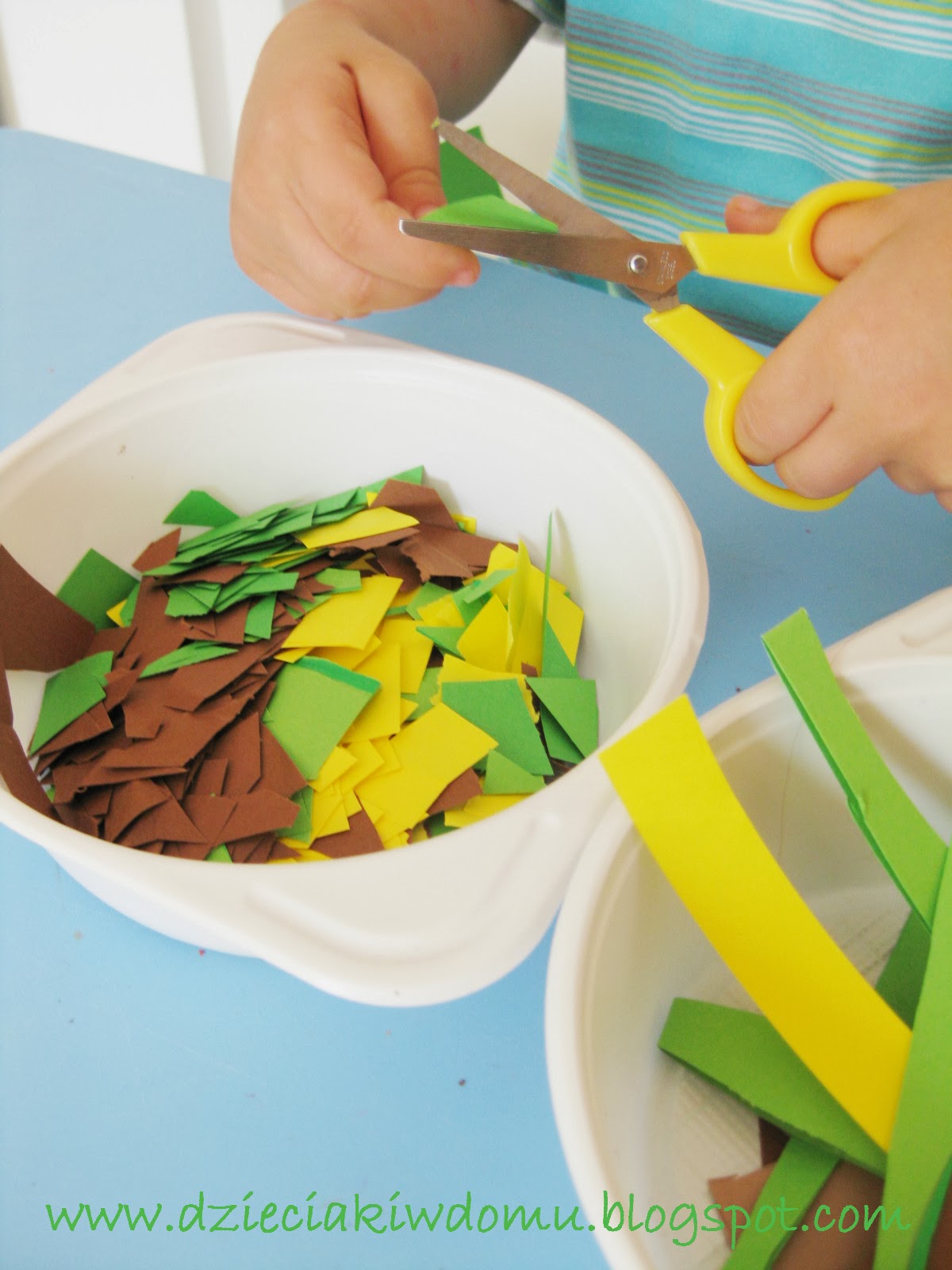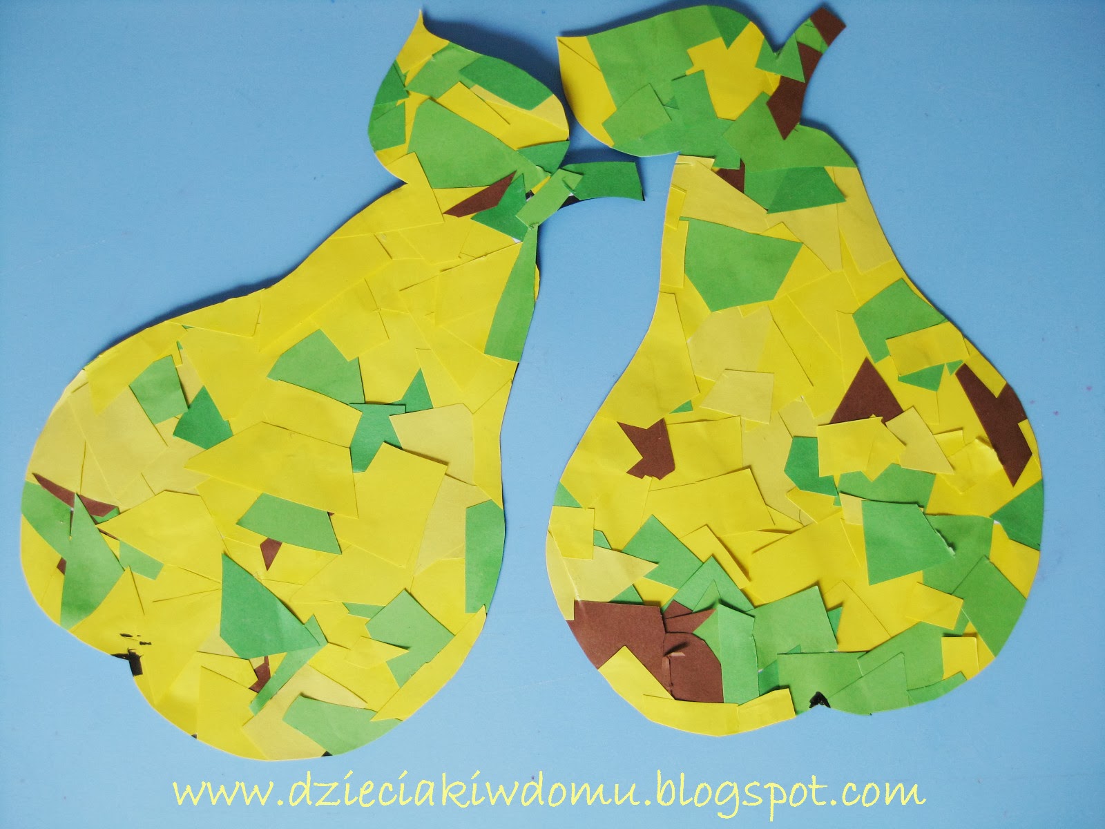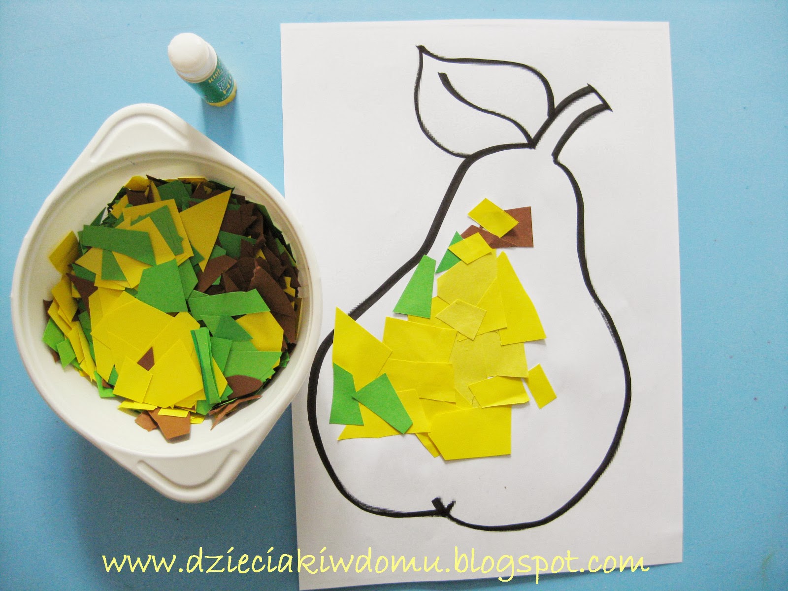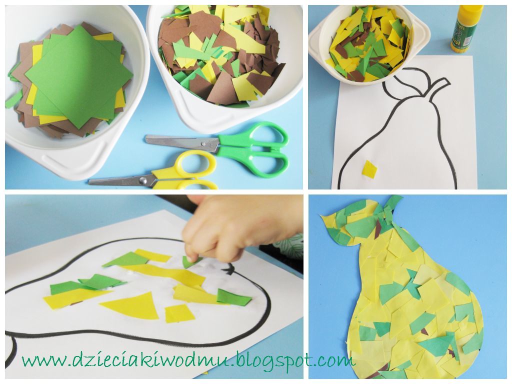 Moi chłopcy uwielbiają ciąć, tak po prostu, bez żadnego konkretnego celu. Zawsze po twórczej pracy zostawiam ścinki i jak tylko trochę ich się nagromadzi, daję chłopcom do zabawy. Wystarczy położyć im na stoliku, a już po chwili są zainteresowani. Potrafią tak wycinać przez dobre pół godziny, a nawet godzinę. Są bardzo skoncentrowani, ręce pracują (mała motoryka), w domu nastaje cisza, a ja mam chwilę dla siebie, czyli tak naprawdę na milion rzeczy, które są do zrobienia. Sami wiecie, jak to jest. Ostatnio ze ścinków powstała zupa, którą chłopcy mieszali i doprawiali. Można je wykorzystać na tysiące sposobów. My tym razem zrobiliśmy gruszki. Wystarczy wykleić ścinkami szablon i praca gotowa. Ważne jest, aby szablon odrysować też na drugiej stronie kartki, ułatwi to późniejsze wycinanie.