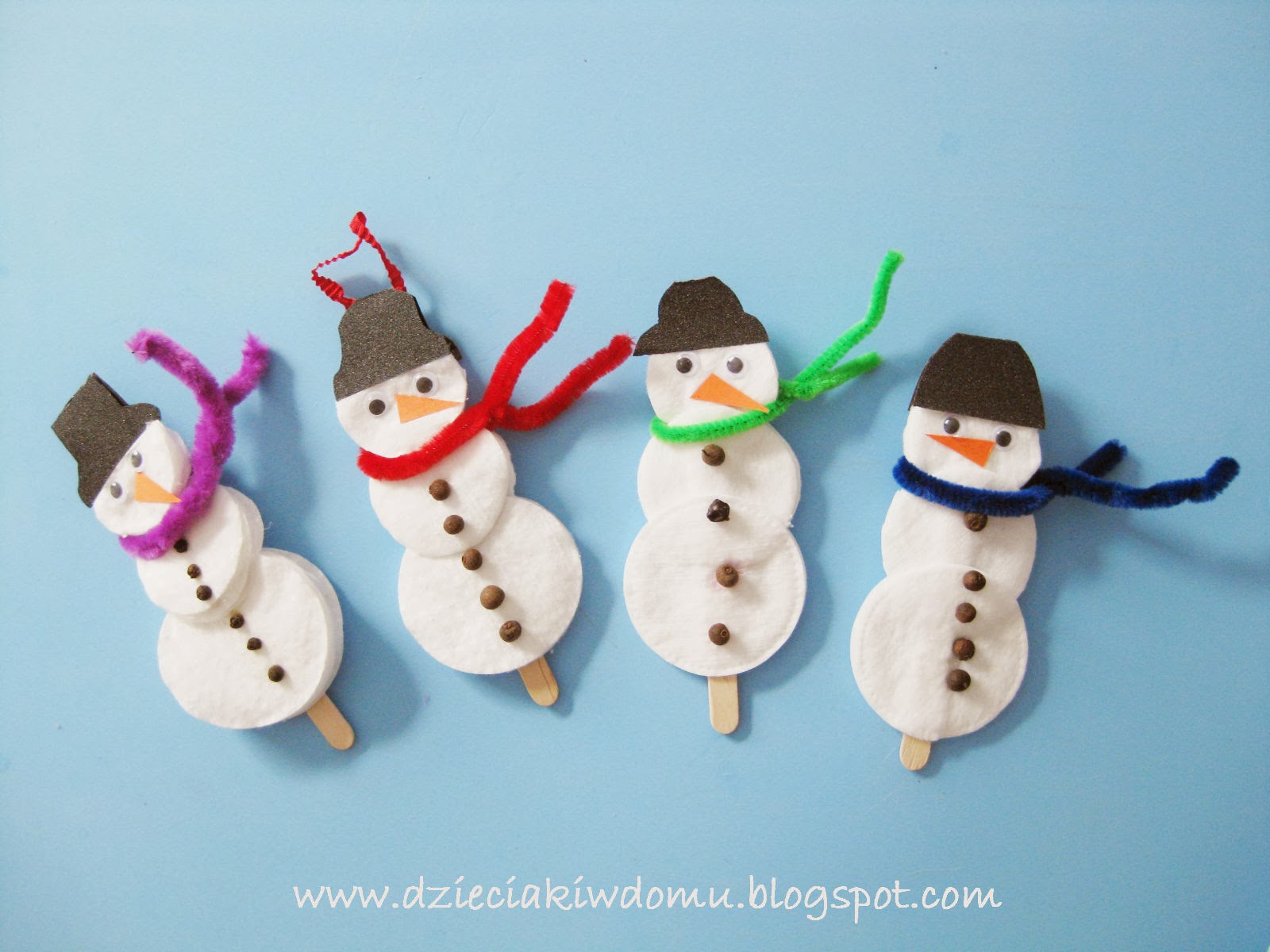 Robiliśmy z chłopcami bałwanki na patyczkach. Najpierw przygotowałam po trzy koła w różnych wielkościach i potem je ze sobą skleiłam (kolejność dobrze widać na zdjęciach). Podczas tej pracy trzeba uważać, żeby zabrudzonymi w kleju palcami nie poniszczyć wacików, dlatego młodszym dzieciom można dać gotowe bałwanki do ozdabiania. Takie bałwanki można również powiesić na choince. A może by tak przygotować świąteczne przedstawienie? Mięciutkie bałwanki świetnie nadają się jako kukiełki do teatrzyku. :)