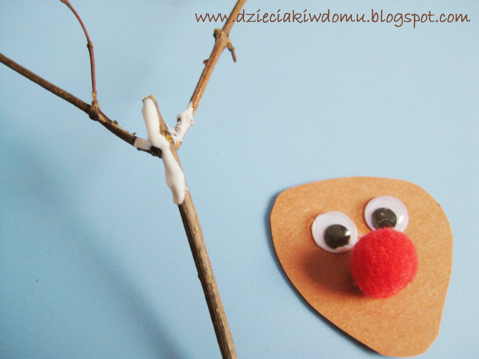 Takie reniferki są bardzo proste do zrobienia, jest to wspaniała aktywność nawet dla najmłodszych dzieci. Do przygotowania naszych reniferów potrzebowaliśmy rozgałęziające się patyki. Nawet nie musieliśmy specjalnie iść na dwór, żeby je pozbierać, ponieważ na naszym balkonie mamy ich całą kolekcję z różnych wypraw. (pisałam Wam o tym tu). Na kawałek brązowego papieru technicznego przyklejaliśmy oczka i czerwone noski i nasze renifery były już gotowe. :)
