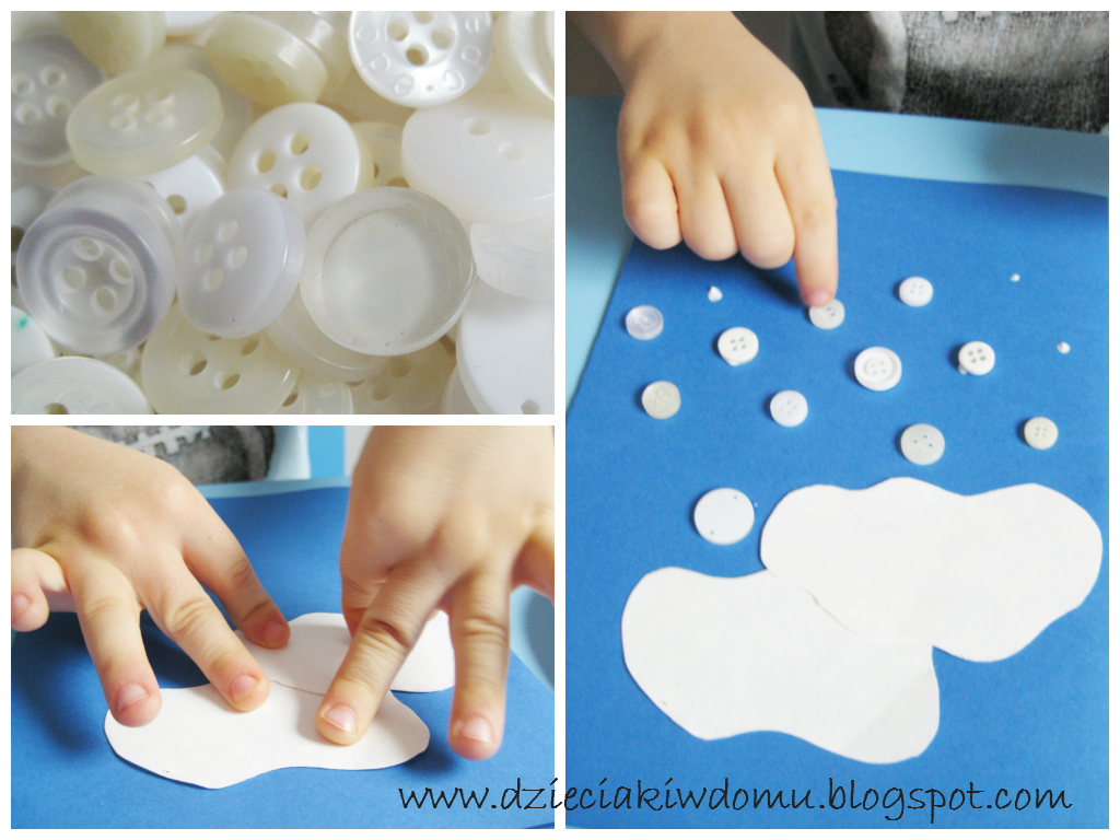 Guziczki przepięknie wyglądają w różnego rodzaju projektach, bardzo lubię ich używać, chociaż mam wrażenie, że łatwiej z nimi będzie się pracowało trochę starszym dzieciom. Wydaje mi się, że dla moich chłopców wymagają jeszcze trochę za dużo precyzji. Natomiast w poniższej kartce nie było to wielkim problemem, ponieważ są one luźno poprzyklejane w dowolnych miejscach. Tęsknicie za śniegiem? Oczekując na niego można wykonać taką prostą i uroczą kartkę. :)