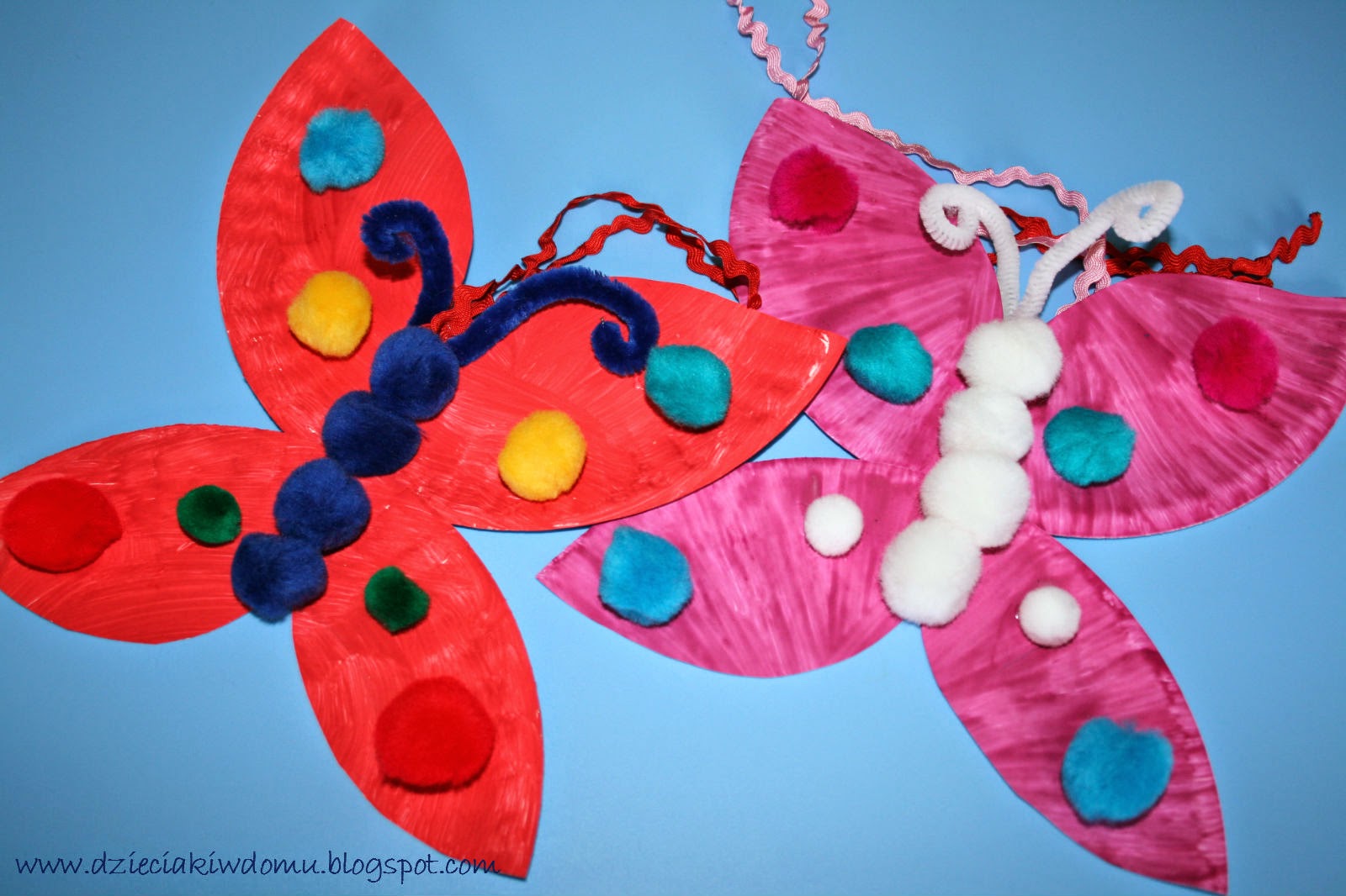 Zrobienie takich motylków wymaga trochę czasu i zaplanowania kolejnych czynności. Najpierw malujemy talerze farbami. Allan bardzo lubi malować po papierowych talerzykach, zamalowuje sobie każdy starannie na inny kolor. Potem zostawiamy talerzyki do wyschnięcia i dopiero kolejnego dnia możemy zacząć tworzyć :) Najpierw odrysowałam kształt skrzydeł motyla na talerzach (widać to bardzo dobrze na zdjęciach), potem wycięłam i obydwie części sczepiłam zszywaczem. Następnie zrobiłam trzy dziurki po środku górnych skrzydełek: jedną na sznurek i dwie kolejne na czułki. Na koniec Allanek ozdabiał motylki. Zrobiliśmy ich całkiem sporo, niektóre były całe w kropki :) Ćwiczyliśmy też kolory, przygotowywałam jedną stronę motyla, a Allan ją odwzorowywał.