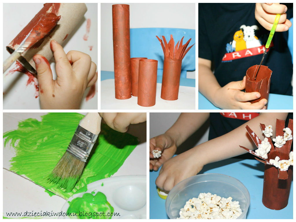 Do wykonania jednego drzewka można wykorzystać dwie rolki po papierze toaletowym, jedną na pień, a drugą na konary. Gdy są już pomalowane i suche, nacinamy jedną z nich tworząc koronę drzewa i wkładamy w drugą. Drugim wariantem jest rolka po papierowych ręcznikach kuchennych. Jest na tyle długa, że wystarczy tylko jedna. My wykorzystaliśmy obydwie opcje.