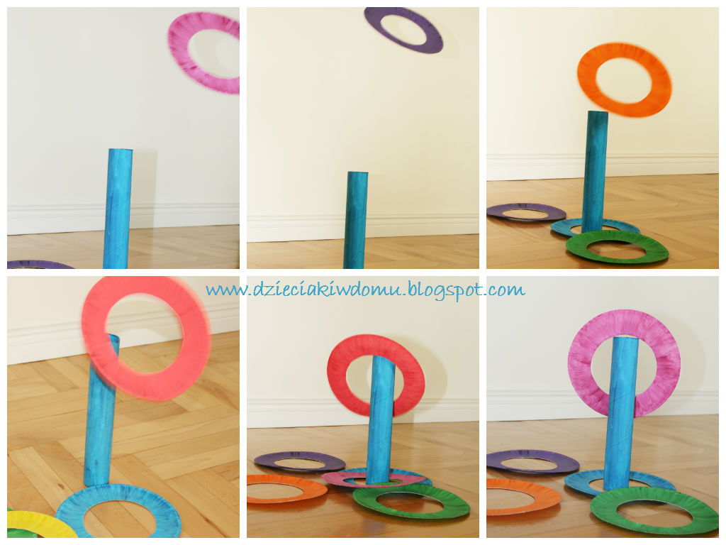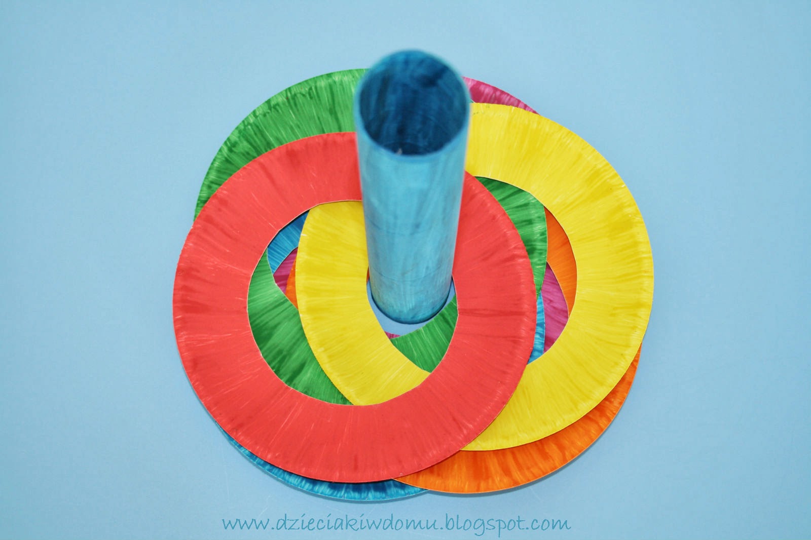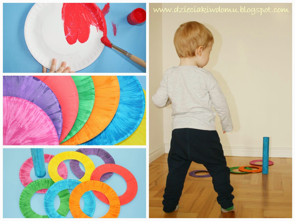 Przy okazji naszych zabaw farbami, Allankowi bardzo spodobało się malowanie talerzyków. Każdy talerzyk malował innym kolorem i bardzo koncentrował się na tym, aby pokryć farbą całą ich powierzchnię. Mieliśmy już spory zapas kolorowych talerzyków, stąd pomysł, aby wykorzystać je do kolejnej zabawy. Wycięłam z nich koła w taki sposób, aby powstały obręcze. Na środku pokoju postawiliśmy rolkę po papierowych ręcznikach. Żeby rolka się nie przewracała, włożyliśmy do środka kamienie znalezione podczas naszych spacerów. Potem po kolei staraliśmy się wrzucać wszystkie kółka na rolkę. Fantastyczna zabawa. Na koniec każdy z nas otrzymał medal :) Ale o tym opowiem Wam już w kolejnym poście.