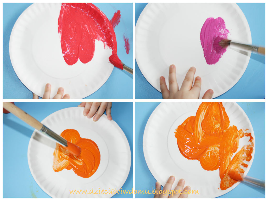 Potrzebne będą: papierowe talerzyki, farby, rolka po papierowych ręcznikach.