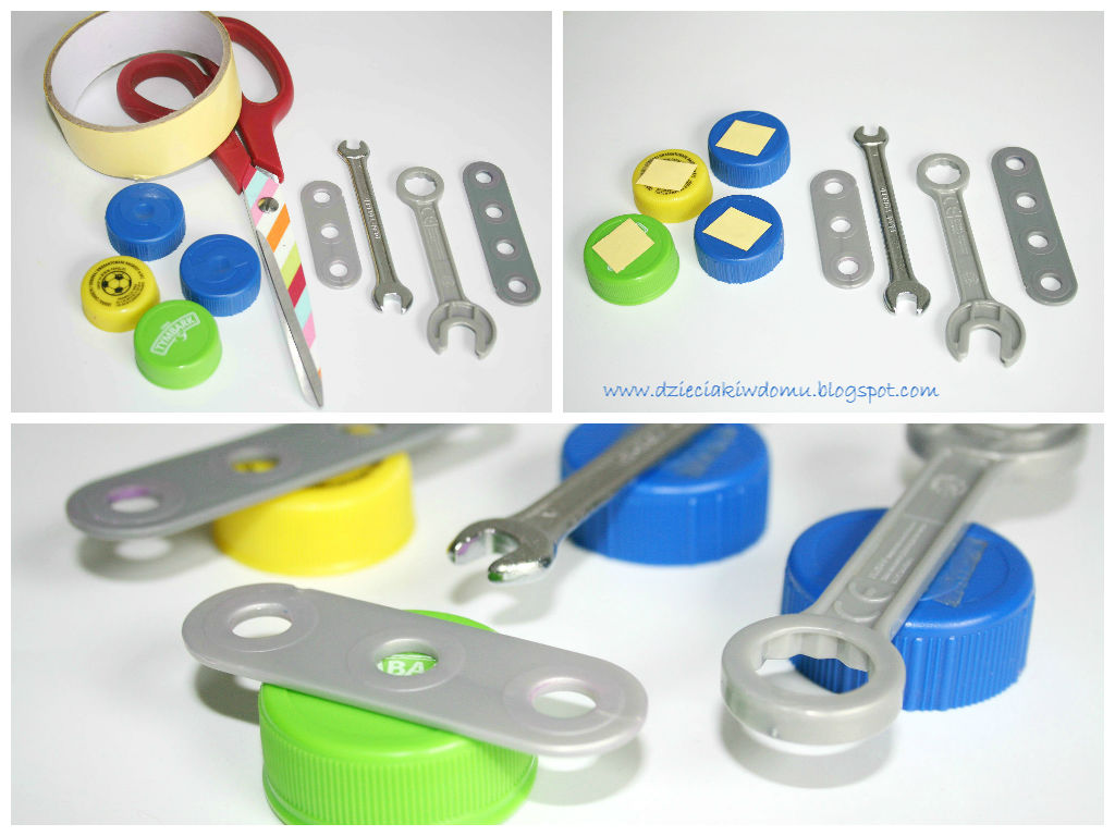 Potrzebne będą: farby, pędzelek, taśma dwustronna, nakrętki po butelkach, śrubki, klucze, narzędzia zabawkowe i prawdziwe, kolorowe kartki z bloku technicznego
